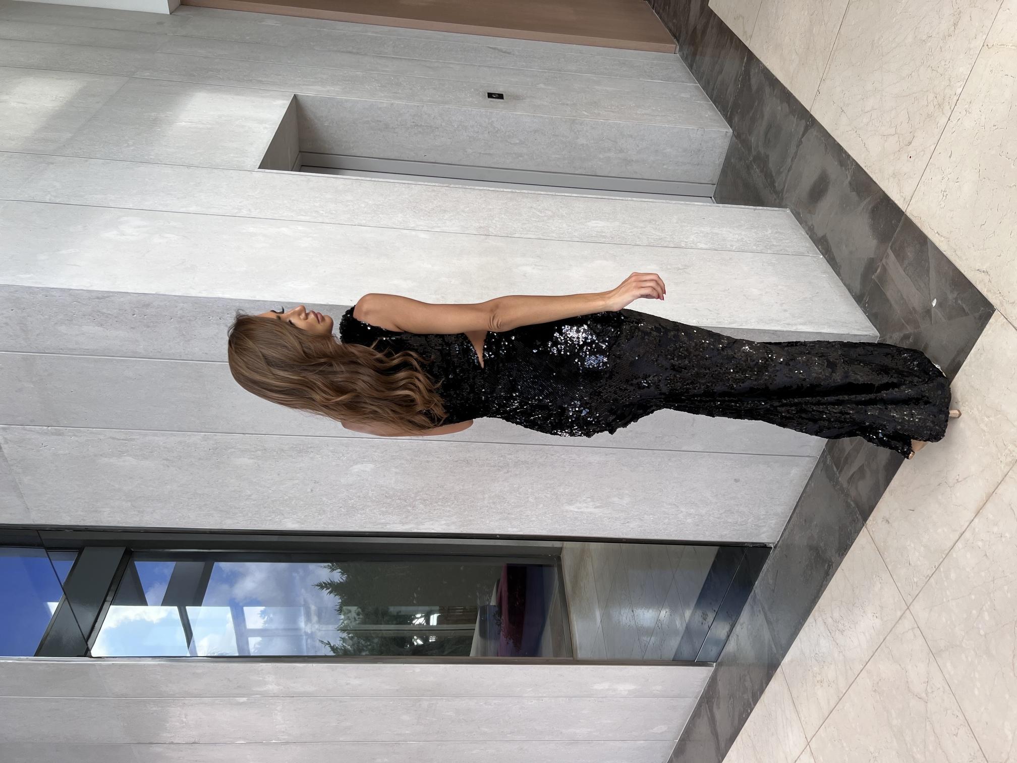 High Slit One Shoulder Cutout Black Sparkly Party Maxi Dress